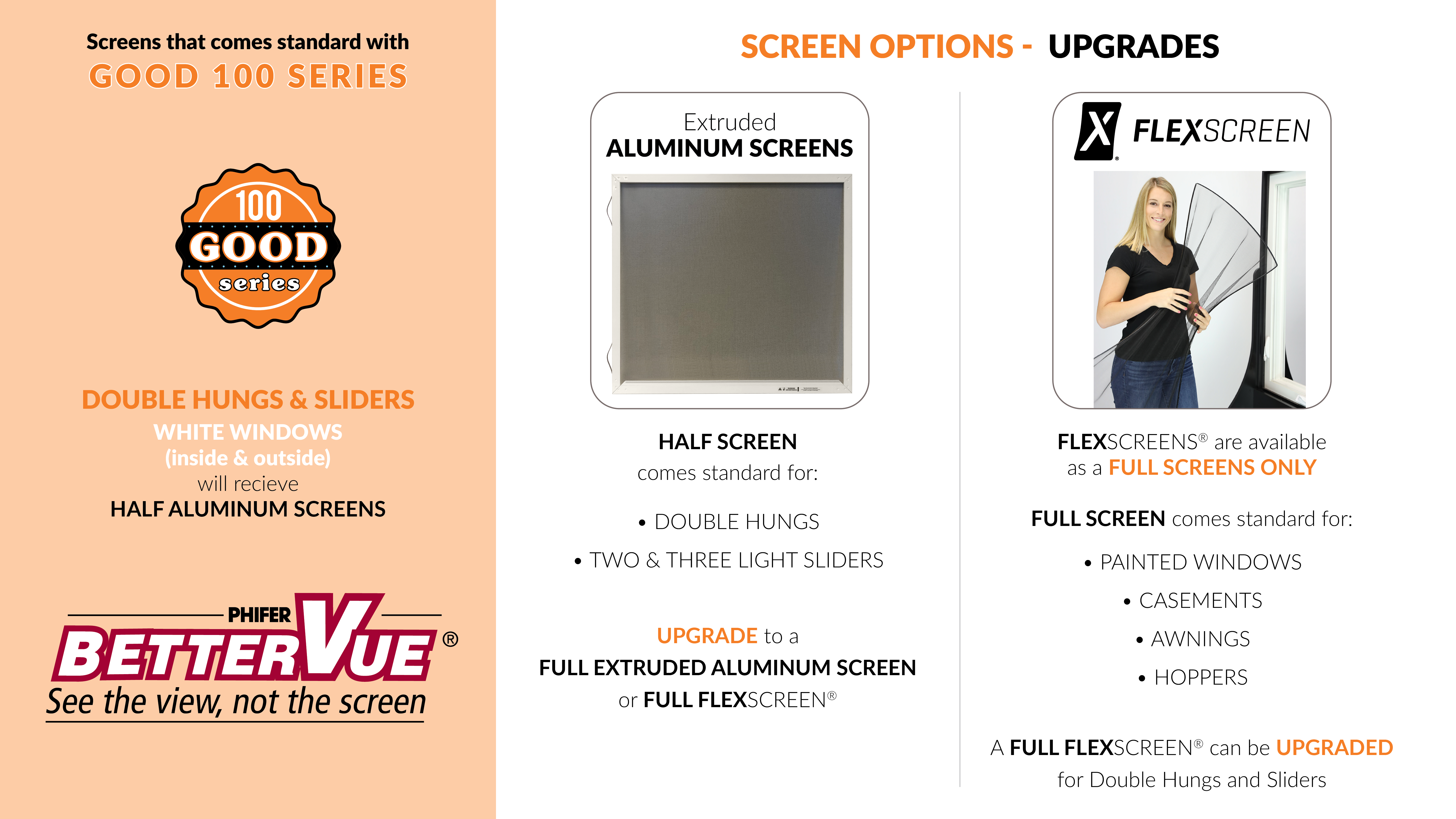 - EXTRUDED ½ SCREEN WITH BETTER VUE® – Screening provides improved visibility, enhanced insect performance, air flow and light transmission