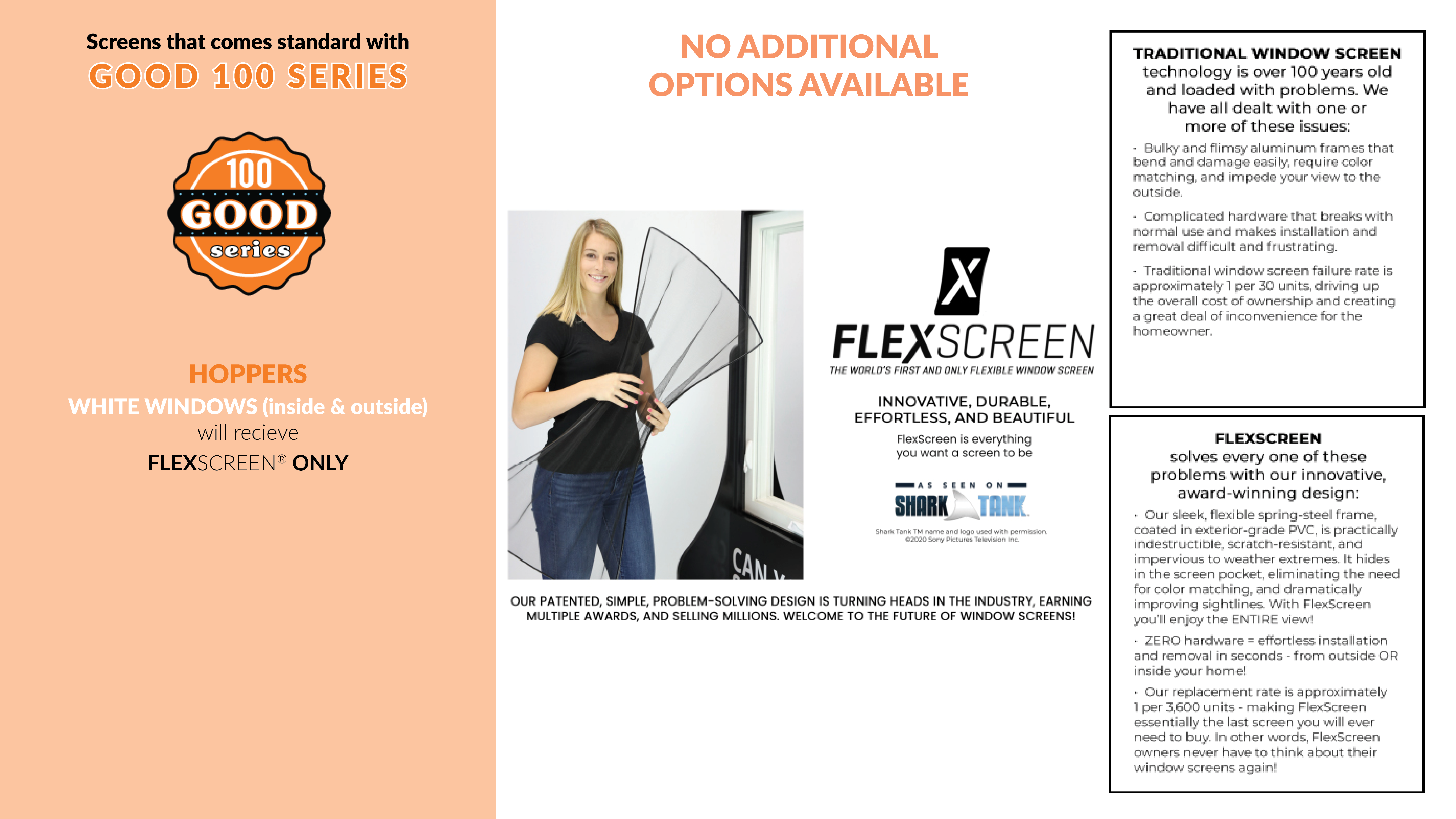 • FLEXSCREEN WITH BETTER VUE® – Screening provides improved visibility, enhanced insect performance, air flow and light transmission