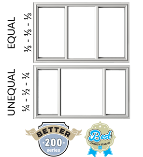 a window divided into 3 sections, equal or unequal configurations – a picture window in the center with a sliding panel on each side.